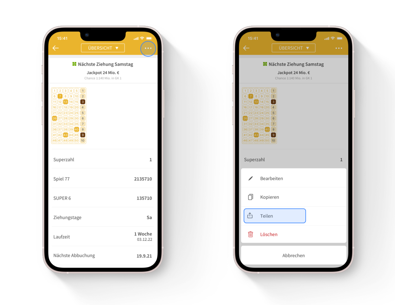 Nun müsst ihr euren Spielschein noch mit euren Co-Tippern teilen. Das funktioniert mit nur wenigen Klicks in deiner Clever Lotto App. Gehe zu deinen Spielscheinen, suche den gemeinsam getippten Spielschein aus und gehe rechts oben auf die 3 Menüpunkte. Hier könnt ihr den Spielschein teilen und aussuchen, mit welcher App das passieren soll. Clever Lotto generiert einen Link mit Zugriff auf deinen Spielschein und diesen können deine Co-Tipper dann in ihrer Clever Lotto App öffnen und speichern.